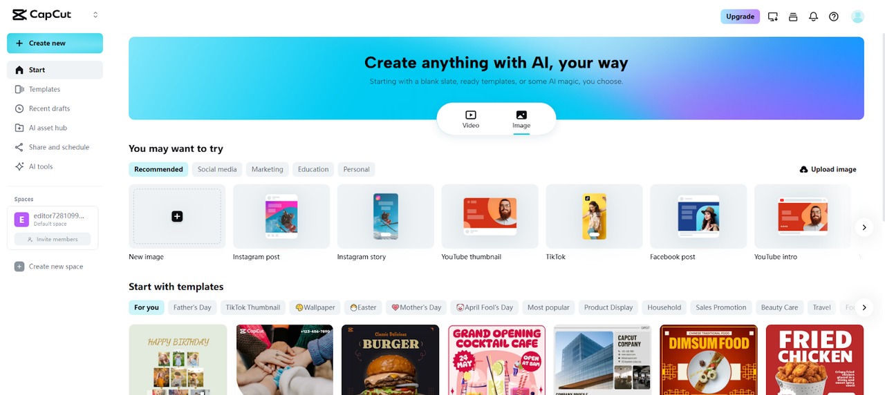 Step 1: Start your project Log in CapCut and select "Image" from the main menu. Then click "New image" to reach the CapCut web editing interface.