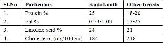 B. Meat quality: The meat of Kadaknath is of superior quality, with other breeds of chicken have very little fat.