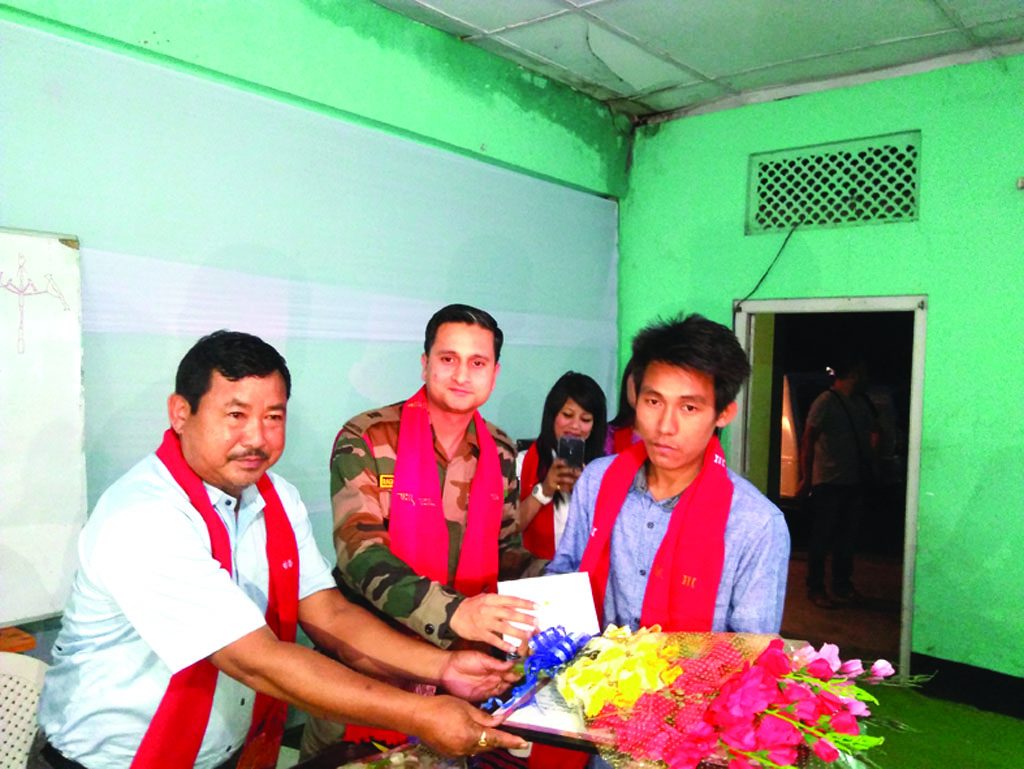 Diphu, May 5 (EMN): Diphu youth Dhon Killing, who bagged a bronze during the recently concluded 3rd India Open International Taekwondo Championship, received a cash award from the Garwal Regiment of the Indian army during a felicitation ceremony organised by the Karbi Students Association (KSA-Inglongpho) here in the conference hall of the office of Central Executive Committee, KSA, at Rongthe-ang, on Saturday.
