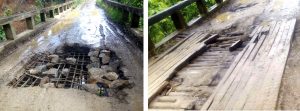 Vehicles have to slow down at frequent intervals to negotiate the deep hole on the bridge. The hole on the bridge has not been repaired, resulting in the widening of the gap. Organisations had filled up the gap with wood which still stands strong but without assurance.