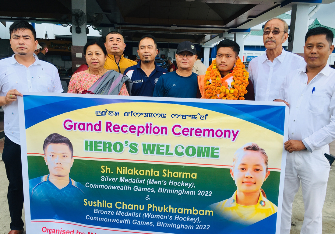Imphal, Aug. 14 (EMN): Two Manipuri hockey players -- Sh Nilakanta Sharma and Sushila Chanu Pukhrambam -- who made India proud in the recently concluded Birmingham Commonwealth Games 2022, by winning silver and bronze medals as part of the national men’s and women’s hockey teams respectively -- were accorded a warm welcome when they returned home on Sunday.