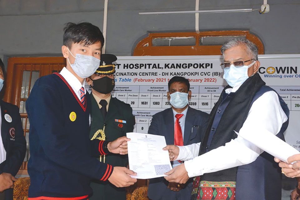 Deputy Commissioner, Senapati and Health officials brief on the coverage, preparedness and assured coverage of maximum population in the programme. Governor also distributed Vaccination Certificates to the beneficiaries, while urging the district administration to interact with school authorities for their support to ensure maximum enrolment of students in the vaccination programme.