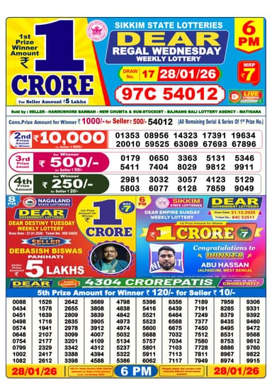 According to the official information provided by the Nagaland State Lotteries, the winning number of Dear Dear Regal Wednesday, the 17th draw held at 6 pm Wednesday, is 97C 54012 the winner of the 1st prize will receive INR 1 crore for a ticket priced at INR 7.