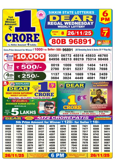 Here is the official result of the Nagaland State Lottery Sambad Dear Regal Wednesday at 6 pm on November 26, 2025
