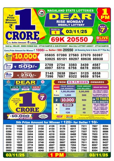According to the official information provided by the Nagaland State Lotteries, the winning number of Dear Dear Rise Monday, the 1st draw held at 1 pm Monday, is 69K 20550 the winner of the 1st prize will receive INR 1 crore for a ticket priced at INR 7.