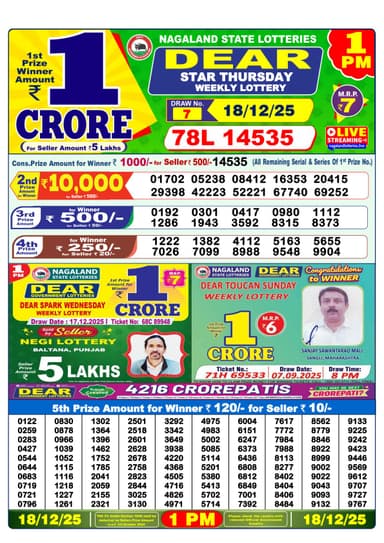 According to the official information provided by the Nagaland State Lotteries, the winning number of Dear Dear Star Thursday, the 7th draw held at 1 pm Thursday, is 78L 14535 the winner of the 1st prize will receive INR 1 crore for a ticket priced at INR 7.