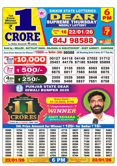 According to the official information provided by the Nagaland State Lotteries, the winning number of Dear Dear Supreme Thursday, the 16th draw held at 6 pm Thursday, is 84J 98588 the winner of the 1st prize will receive INR 1 crore for a ticket priced at INR 7.