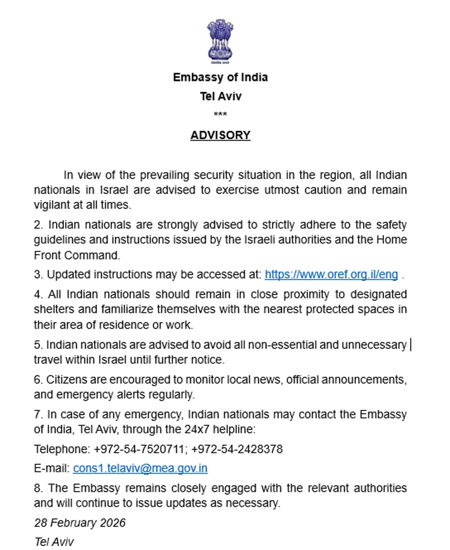 "Indian nationals are advised to avoid all non-essential and unnecessary travel within Israel until further notice. Citizens are encouraged to monitor local news, official announcements, and emergency alerts regularly," it said. The mission also urged Indian nationals to contact the embassy in Tel Aviv in case of any emergency.