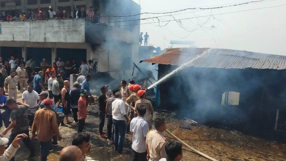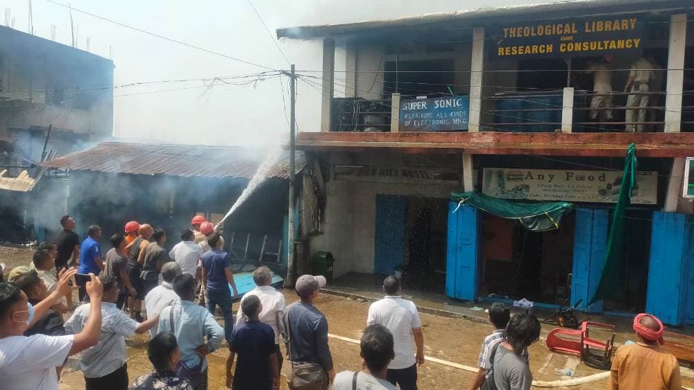 A fire in Mokokchung town gutted nine shops and damaged several buildings in Dilong Ward, with firefighters battling the blaze for over two hours.