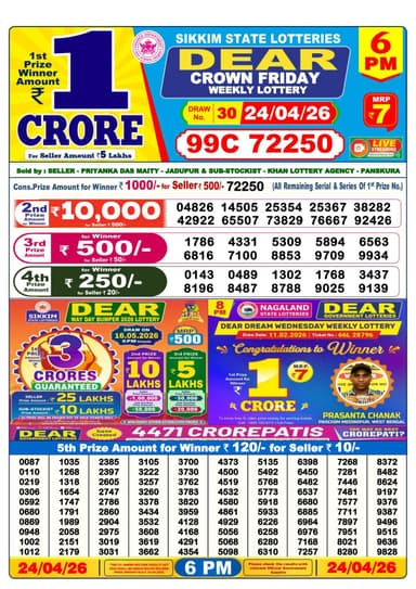 Here is the official result of the Nagaland State Lottery Sambad Dear Crown Friday at 6 pm on April 24, 2026
