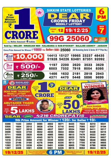 According to the official information provided by the Nagaland State Lotteries, the winning number of Dear Dear Crown Friday, the 12th draw held at 6 pm Friday, is 99G 25060 the winner of the 1st prize will receive INR 1 crore for a ticket priced at INR 7.