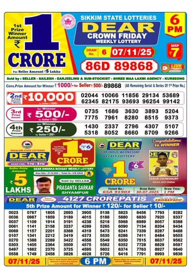 According to the official information provided by the Nagaland State Lotteries, the winning number of Dear Dear Crown Friday, the 1st draw held at 6 pm Friday, is 86D 89868 the winner of the 1st prize will receive INR 1 crore for a ticket priced at INR 7.