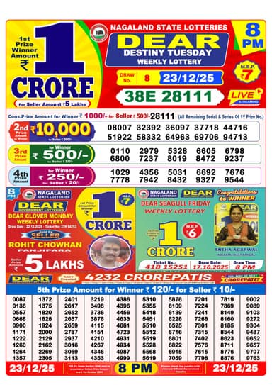 Here is the official result of the Nagaland State Lottery Sambad Dear Destiny Tuesday at 8 pm on December 23, 2025