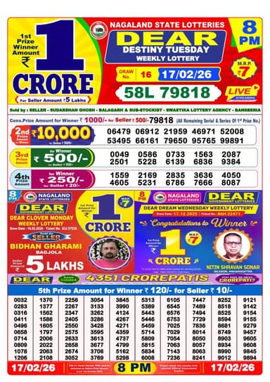 Here is the official result of the Nagaland State Lottery Sambad Dear Destiny Tuesday at 8 pm on February 17, 2026