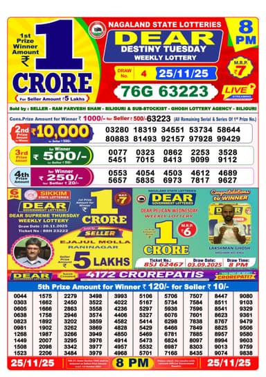 Here is the official result of the Nagaland State Lottery Sambad Dear Destiny Tuesday at 8 pm on November 25, 2025