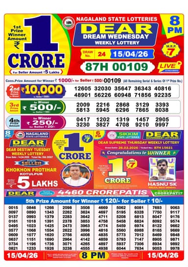 Here is the official result of the Nagaland State Lottery Sambad Dear Dream Wednesday at 8 pm on April 15, 2026