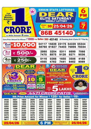 Here is the official result of the Nagaland State Lottery Sambad Dear Elite Saturday at 6 pm on April 25, 2026