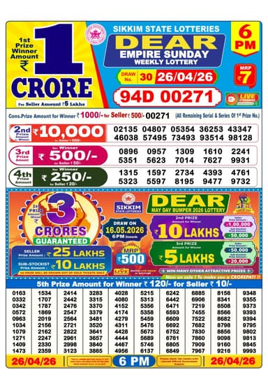 Here is the official result of the Nagaland State Lottery Sambad Dear Empire Sunday at 6 pm on April 26, 2026