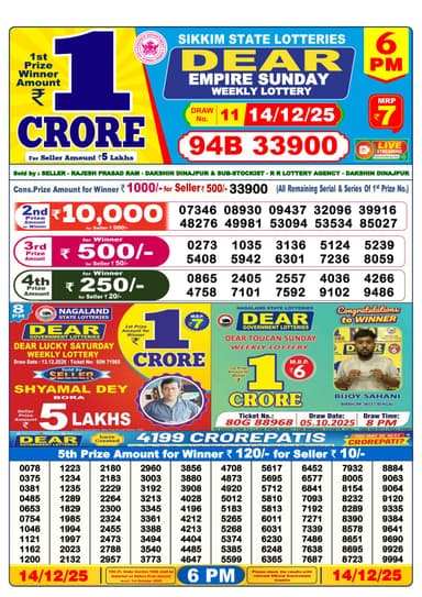 According to the official information provided by the Nagaland State Lotteries, the winning number of Dear Dear Empire Sunday, the 11th draw held at 6 pm Sunday, is 94B 33900 the winner of the 1st prize will receive INR 1 crore for a ticket priced at INR 7.