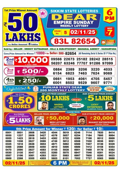 Here is the official result of the Nagaland State Lottery Sambad Dear Empire Sunday at 6 pm on November 2, 2025