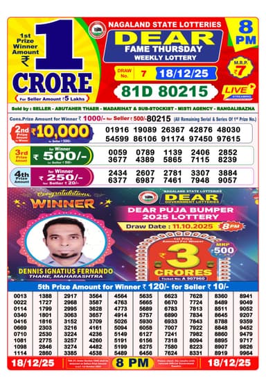 Here is the official result of the Nagaland State Lottery Sambad Dear Fame Thursday at 8 pm on December 18, 2025