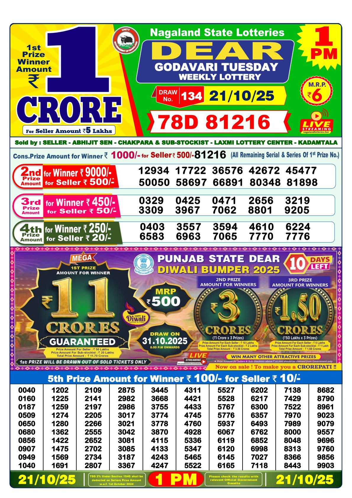 Here is the official result of the Nagaland State Lottery Sambad Dear Godavari Tuesday at 1 pm on Ocotber 21, 2025