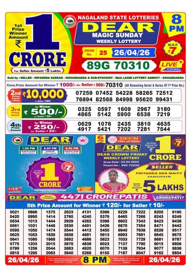 Here is the official result of the Nagaland State Lottery Sambad Dear Magic Sunday at 8 pm on April 26, 2026