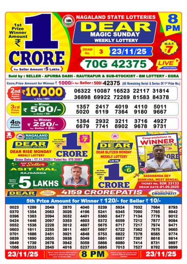 Here is the official result of the Nagaland State Lottery Sambad Dear Magic Sunday at 8 pm on November 23, 2025