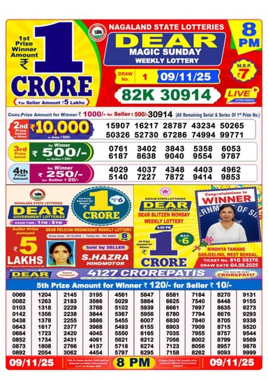 According to the official information provided by the Nagaland State Lotteries, the winning number of Dear Dear Magic Sunday, the 1st draw held at 8 pm Sunday, is 82K 30914 the winner of the 1st prize will receive INR 1 crore for a ticket priced at INR 7.