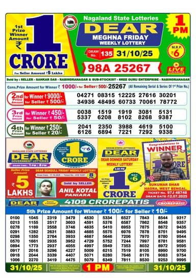 According to the official information provided by the Nagaland State Lotteries, the winning number of Dear Dear Meghna Friday, the 135th draw held at 1 pm Friday, is 98A 25267 the winner of the 1st prize will receive INR 1 crore for a ticket priced at INR 6.