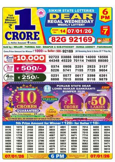 According to the official information provided by the Nagaland State Lotteries, the winning number of Dear Dear Regal Wednesday, the 14th draw held at 6 pm Wednesday, is 82G 92169 the winner of the 1st prize will receive INR 1 crore for a ticket priced at INR 7.