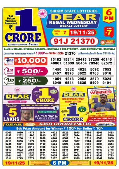 Here is the official result of the Nagaland State Lottery Sambad Dear Regal Wednesday at 6 pm on November 18, 2025