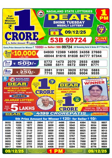 According to the official information provided by the Nagaland State Lotteries, the winning number of Dear Dear Shine Tuesday, the 6th draw held at 1 pm Tuesday, is 53B 99724 the winner of the 1st prize will receive INR 1 crore for a ticket priced at INR 7.