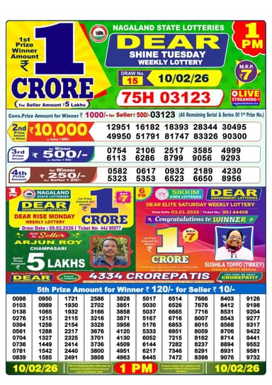 Here is the official result of the Nagaland State Lottery Sambad Dear Shine Tuesday at 1 pm on February 10, 2026