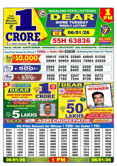Here is the official result of the Nagaland State Lottery Sambad Dear Shine Tuesday at 1 pm on January 6, 2026