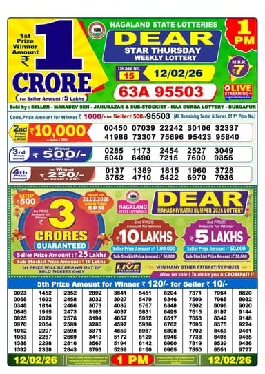 Here is the official result of the Nagaland State Lottery Sambad Dear Star Thursday at 1 pm on February 12, 2026