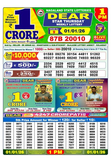 According to the official information provided by the Nagaland State Lotteries, the winning number of Dear Dear Star Thursday, the 9th draw held at 1 pm Thursday, is 87B 20010 the winner of the 1st prize will receive INR 1 crore for a ticket priced at INR 7.