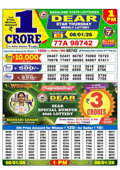 According to the official information provided by the Nagaland State Lotteries, the winning number of Dear Dear Star Thursday, the 10th draw held at 1 pm Thursday, is 77A 98742 the winner of the 1st prize will receive INR 1 crore for a ticket priced at INR 7.