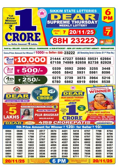 Here is the official result of the Nagaland State Lottery Sambad Dear Supreme Thursday at 6 pm on November 20, 2025