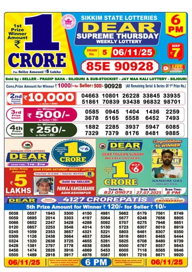 According to the official information provided by the Nagaland State Lotteries, the winning number of Dear Dear Supreme Thursday, the 5th draw held at 6 pm Thursday, is 85E 90928 the winner of the 1st prize will receive INR 1 crore for a ticket priced at INR 7.