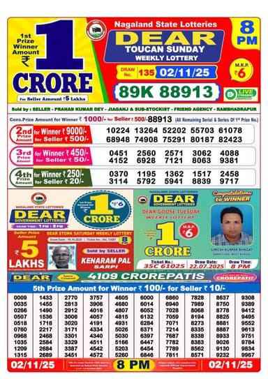 Here is the official result of the Nagaland State Lottery Sambad Dear Toucan Sunday at 8 pm on November 2, 2025