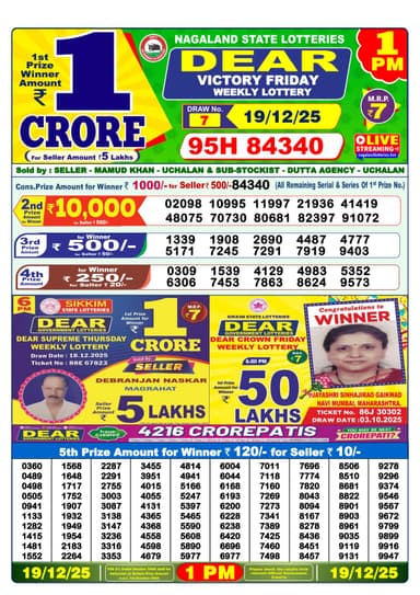 Here is the official result of the Nagaland State Lottery Sambad Dear Victory Friday at 1 pm on December 19, 2025