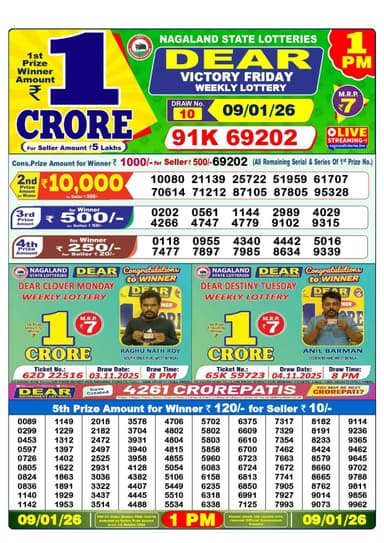 According to the official information provided by the Nagaland State Lotteries, the winning number of Dear Dear Victory Friday, the 10th draw held at 1 pm Friday, is 91K 69202 the winner of the 1st prize will receive INR 1 crore for a ticket priced at INR 7.