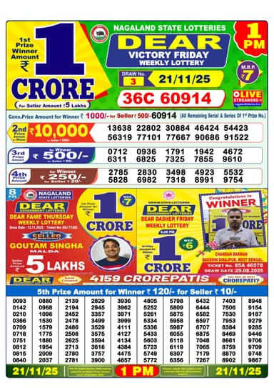 Here is the official result of the Nagaland State Lottery Sambad Dear Victory Friday at 1 pm on November 21, 2025