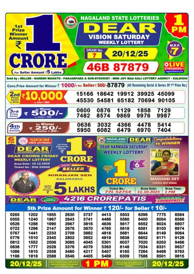 According to the official information provided by the Nagaland State Lotteries, the winning number of Dear Dear Vision Saturday, the 7th draw held at 1 pm Saturday, is 46B 87879 the winner of the 1st prize will receive INR 1 crore for a ticket priced at INR 7.