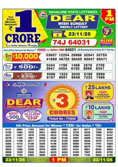 According to the official information provided by the Nagaland State Lotteries, the winning number of Dear Dear Wish Sunday, the 3rd draw held at 1 pm Sunday, is 74J 64031 the winner of the 1st prize will receive INR 1 crore for a ticket priced at INR 7.