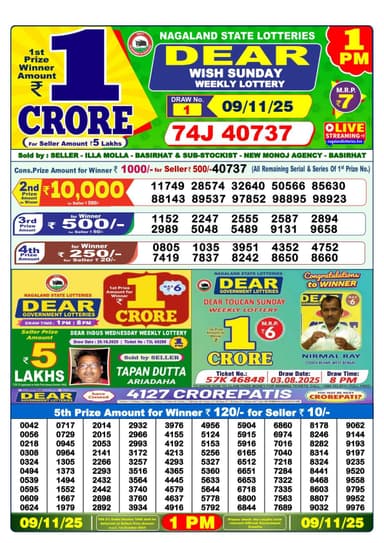 Here is the official result of the Nagaland State Lottery Sambad Dear Wish Sunday at 1 pm on November 9, 2025