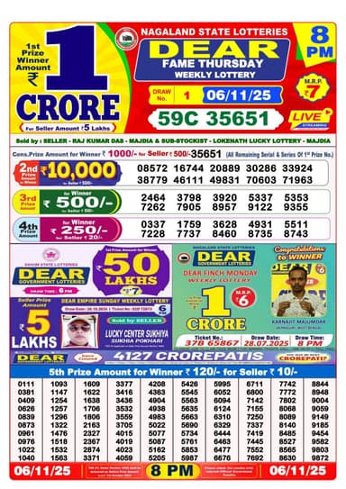 According to the official information provided by the Nagaland State Lotteries, the winning number of Dear Dear Fame Thursday, the 1st draw held at 8 pm Thursday, is 59C 35651 the winner of the 1st prize will receive INR 1 crore for a ticket priced at INR 7.