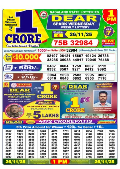 According to the official information provided by the Nagaland State Lotteries, the winning number of Dear Dear Spark Wednesday, the 4th draw held at 1 pm Wednesday, is 75B 32984 the winner of the 1st prize will receive INR 1 crore for a ticket priced at INR 7.