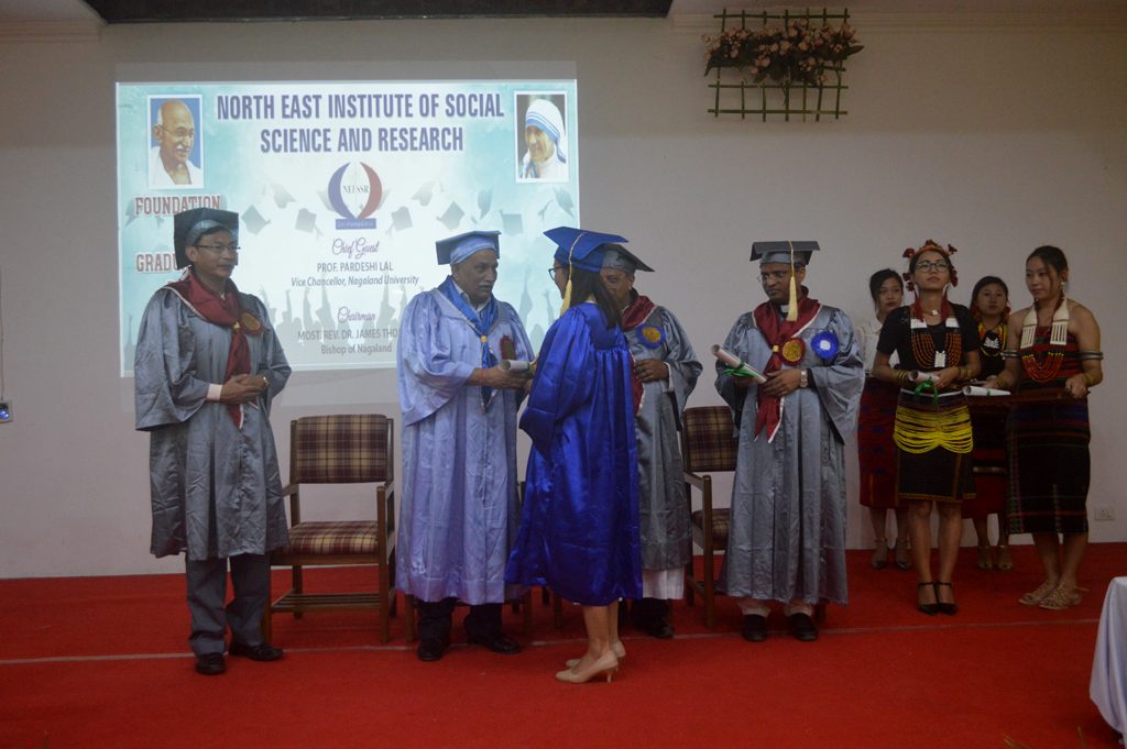 Nagaland University Vice Chancellor, Prof. Pardeshi Lal, felicitating a graduate at the foundation cum graduation day of Northeast Institute of Social Sciences and Research (NEISSR), Dimapur, on October 11. (EM Images)[/caption]